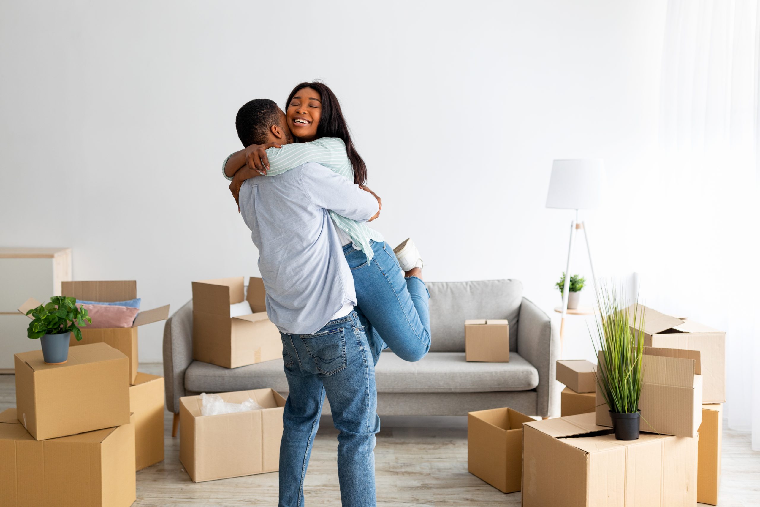 Home owners. Happy african american man hugging and lifting wife, celebrating moving day in their new apartment, free space. Young black tenants feeling excited moving into new property[/caption]