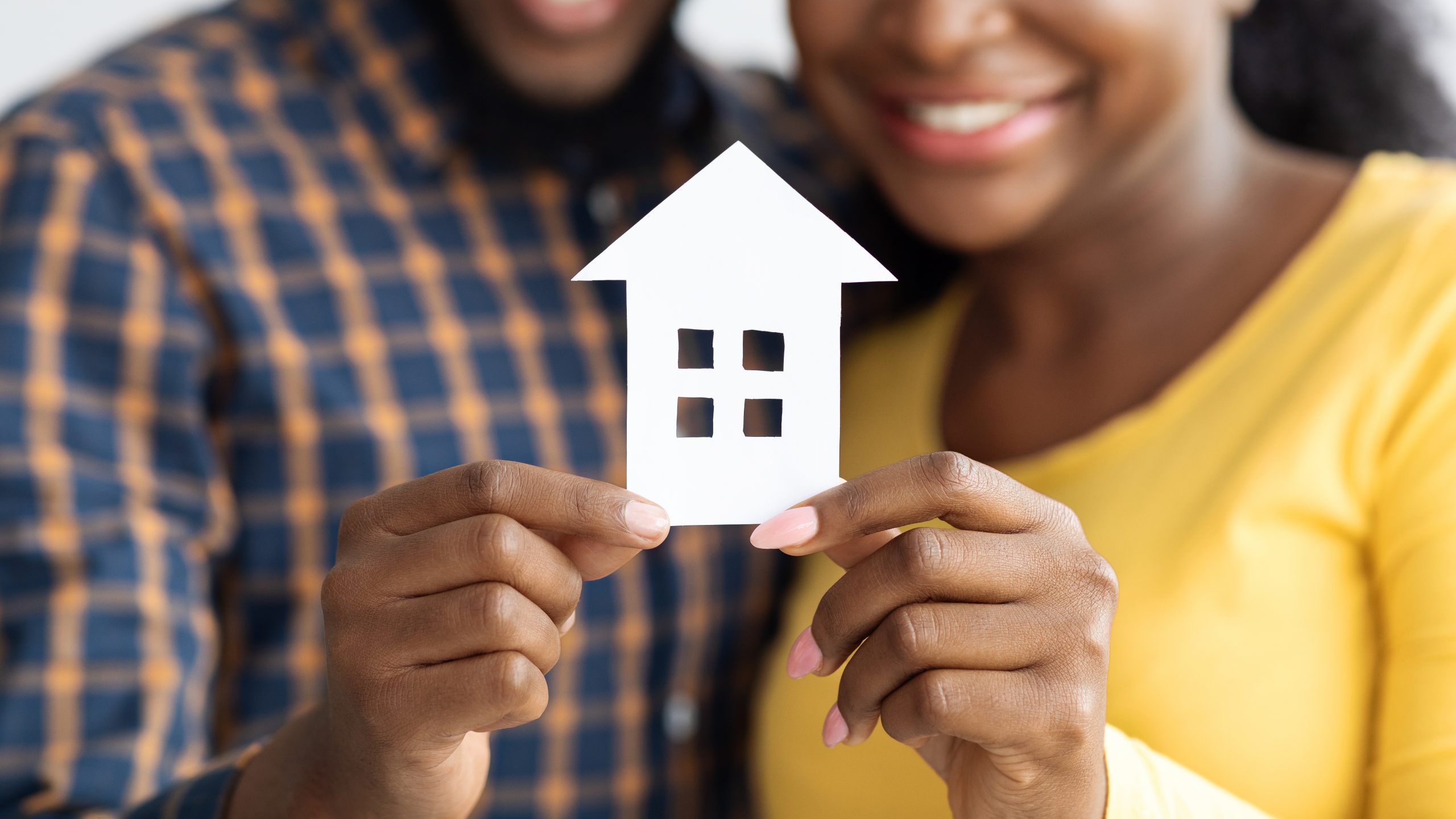 New Home Owners. Happy african american spouses holding paper house figure in hands, cheerful black couple celebrating buying new property or relocation, cropped image with selective focus[/caption]