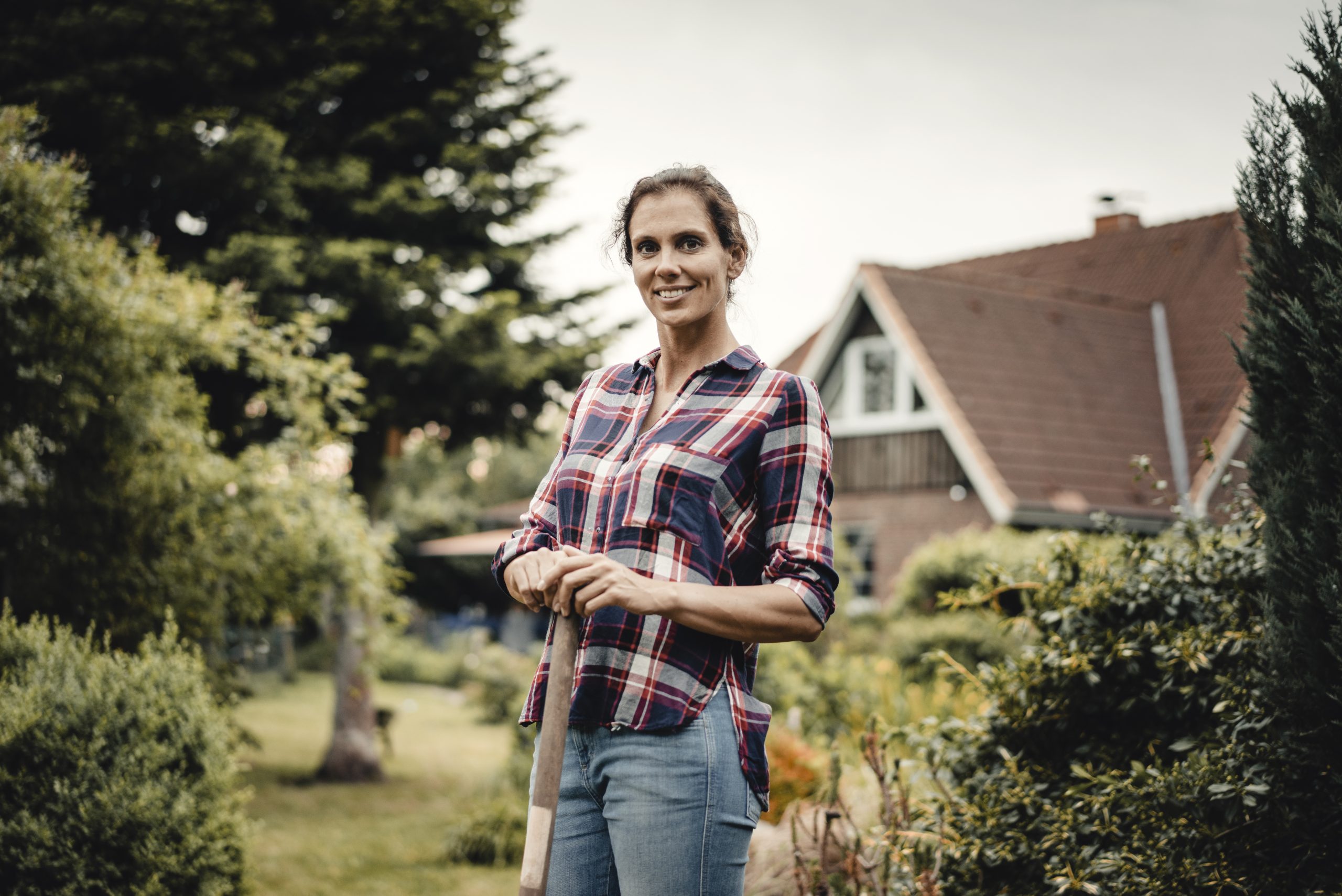 Proud home owner standing in her garden with a spade[/caption]