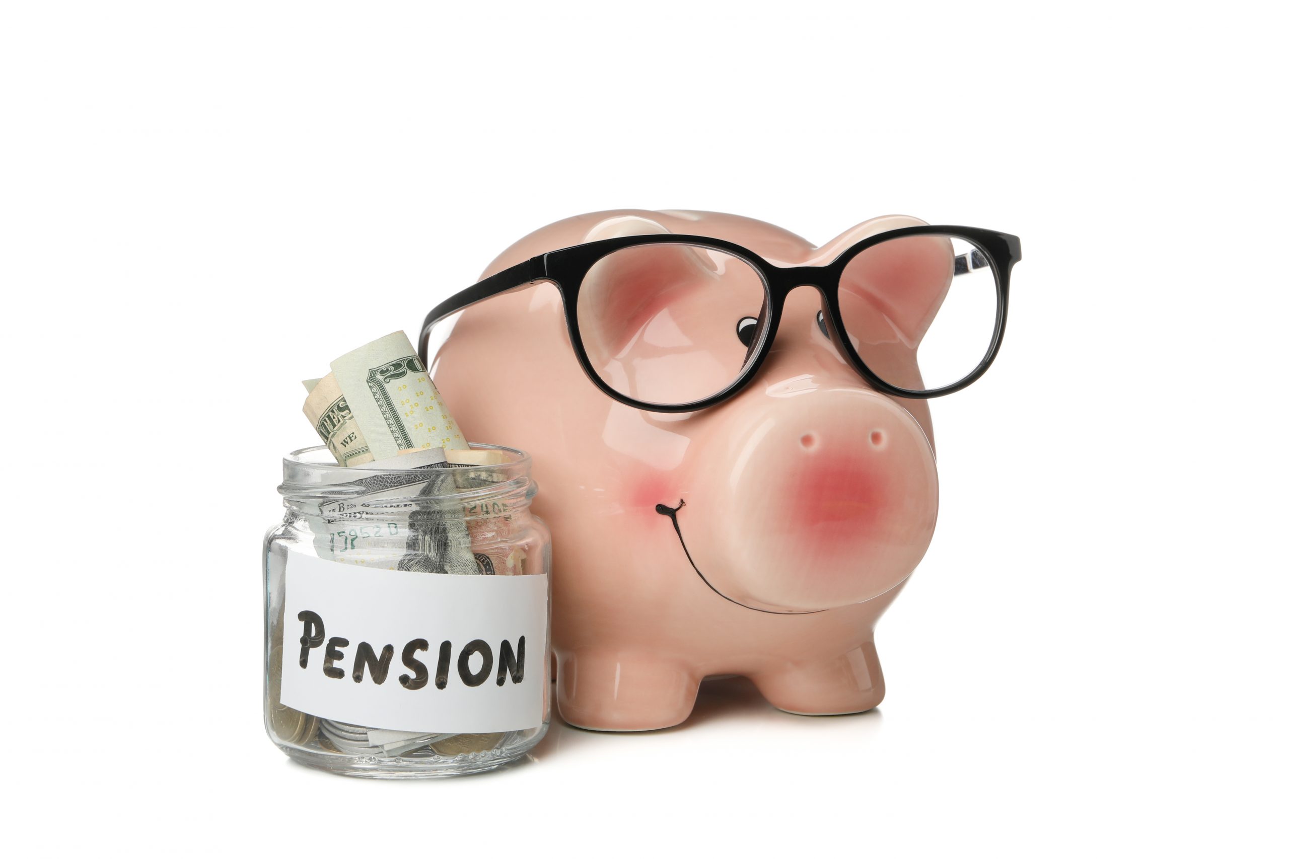 Piggy bank and glass jar with money isolated on white background[/caption]