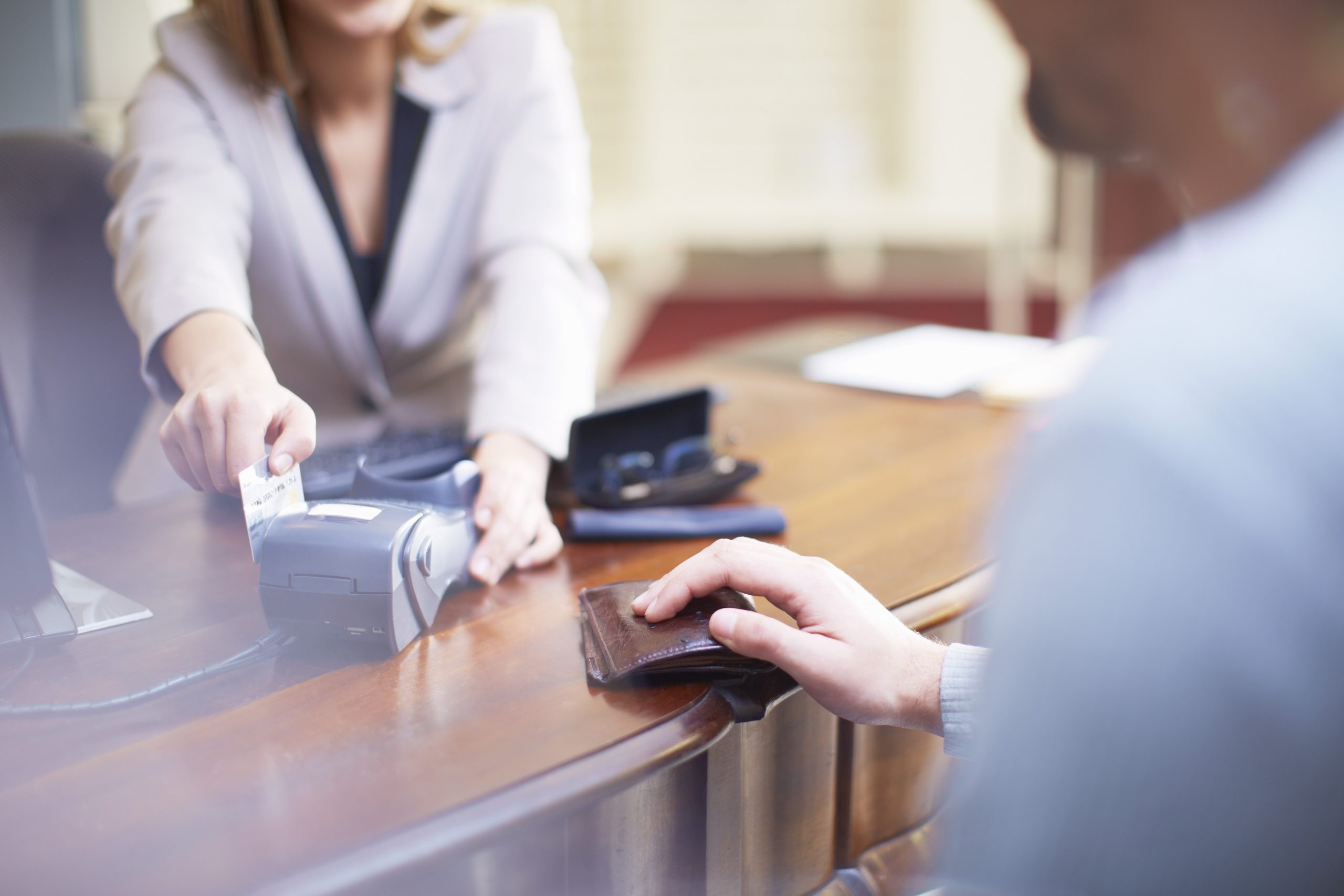 Man at counter paying with credit card[/caption]